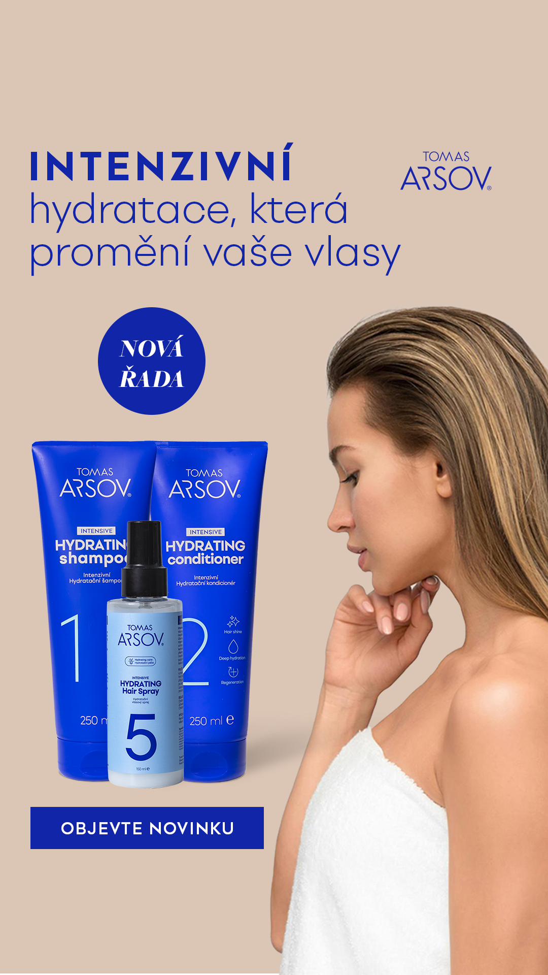 Tato sekce prezentuje komplexní grafické zpracování kampaně pro prémiovou vlasovou kosmetiku značky Tomas Arsov. Projekt byl zaměřen na uvedení a podporu intenzivní hydratační řady, kde bylo klíčové zachovat luxusní positioning a vizuální čistotu značky.